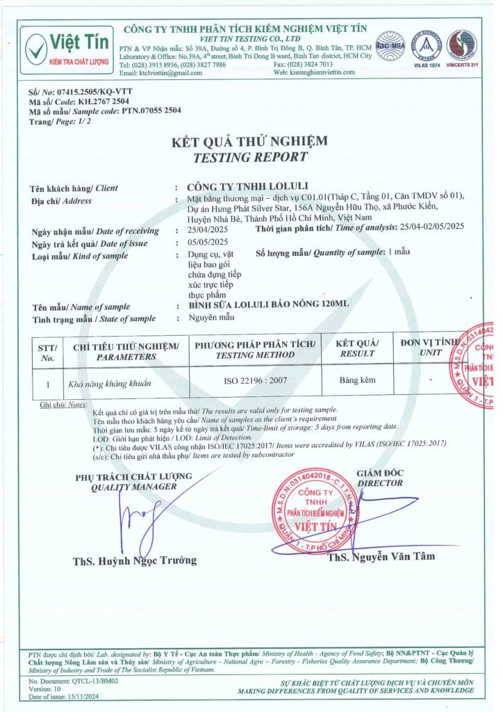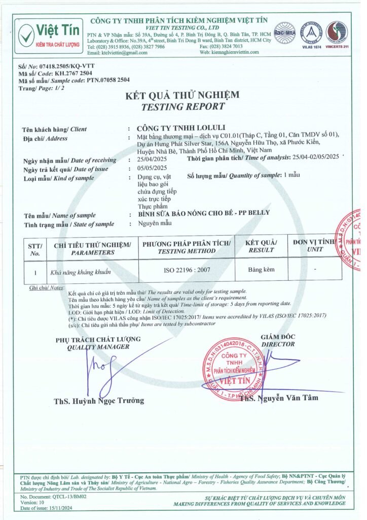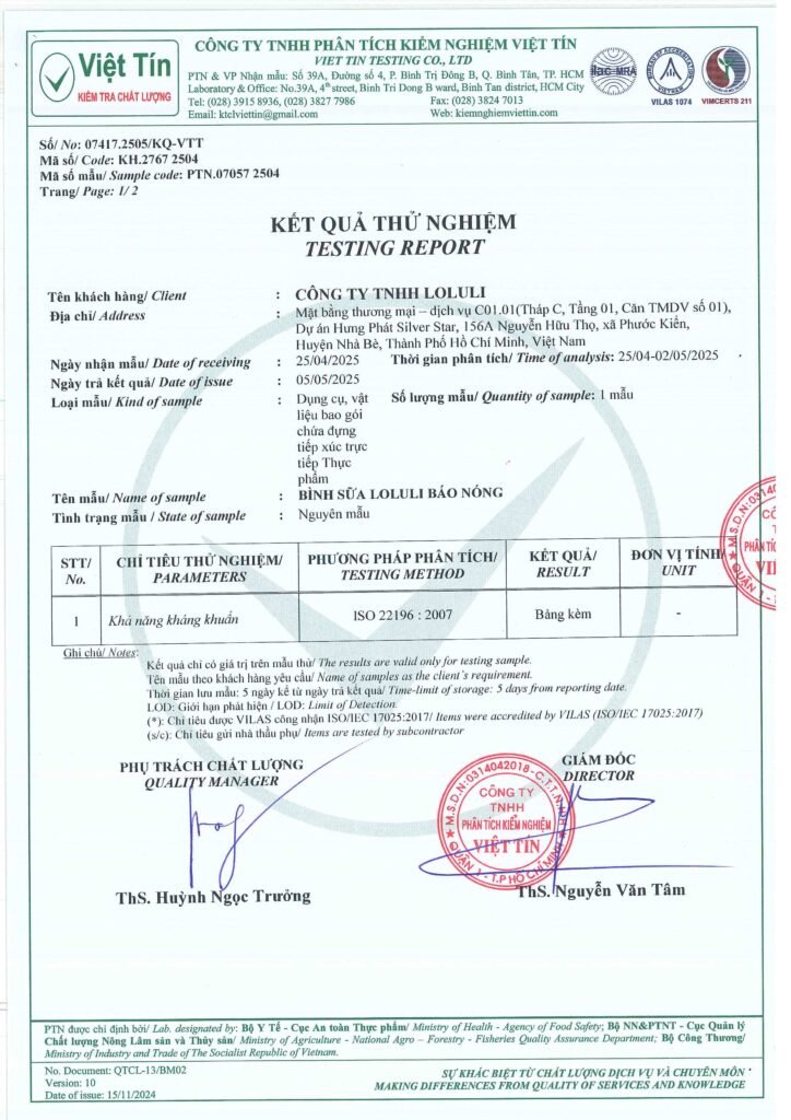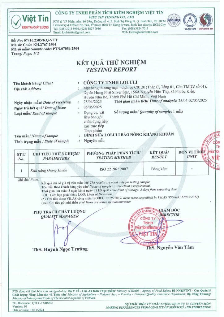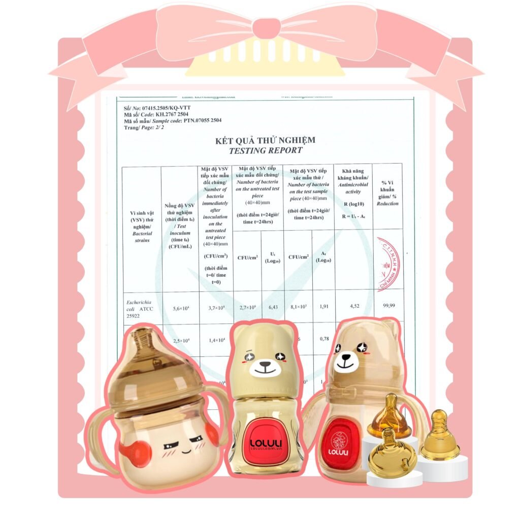 Bình sữa báo nóng kháng khuẩn Loluli vừa được kiểm nghiệm theo tiêu chuẩn quốc tế ISO 22196:2007 và đạt hiệu quả tiêu diệt vi khuẩn lên đến 99,99%. Sản phẩm cho thấy khả năng kháng khuẩn vượt trội với các vi khuẩn nguy hiểm như E. coli, Staphylococcus aureus, Salmonella, và Listeria.
