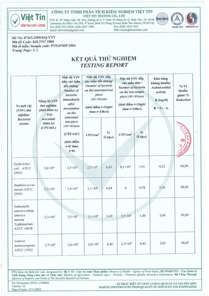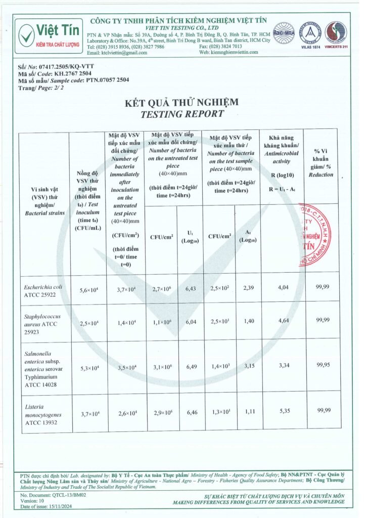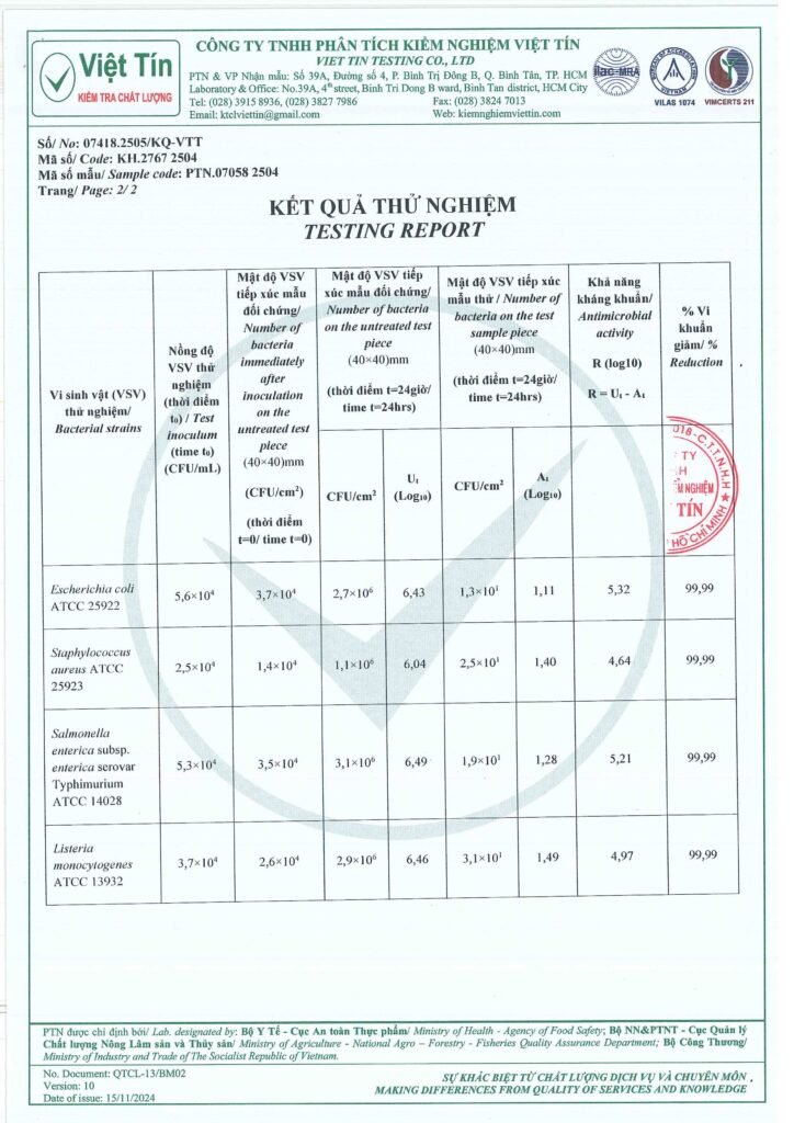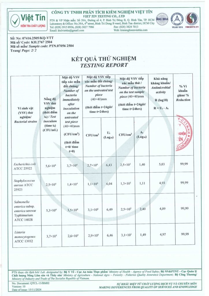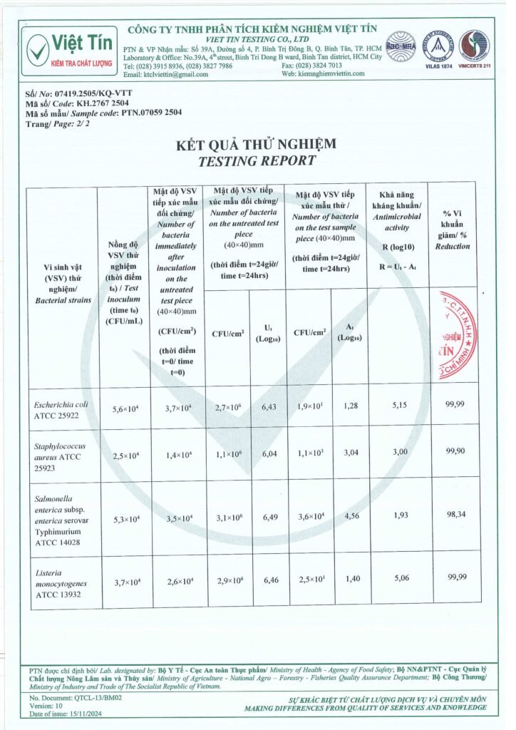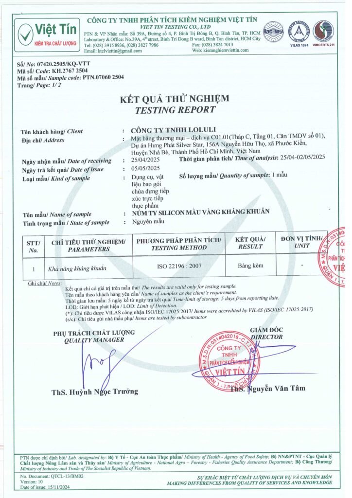 Bình sữa báo nóng kháng khuẩn Loluli vừa được kiểm nghiệm theo tiêu chuẩn quốc tế ISO 22196:2007 và đạt hiệu quả tiêu diệt vi khuẩn lên đến 99,99%. Sản phẩm cho thấy khả năng kháng khuẩn vượt trội với các vi khuẩn nguy hiểm như E. coli, Staphylococcus aureus, Salmonella, và Listeria.