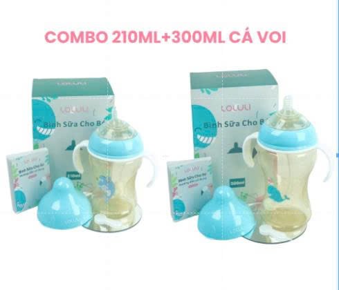 COMBO 2 Bình Sữa Loluli Cổ Rộng Cá Voi Xanh 210ml & 300ml