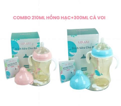 COMBO 2 Bình Sữa Loluli Cổ Rộng Hạc Hồng 210ml & Cá voi xanh 300ml